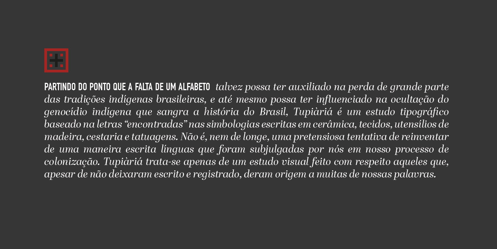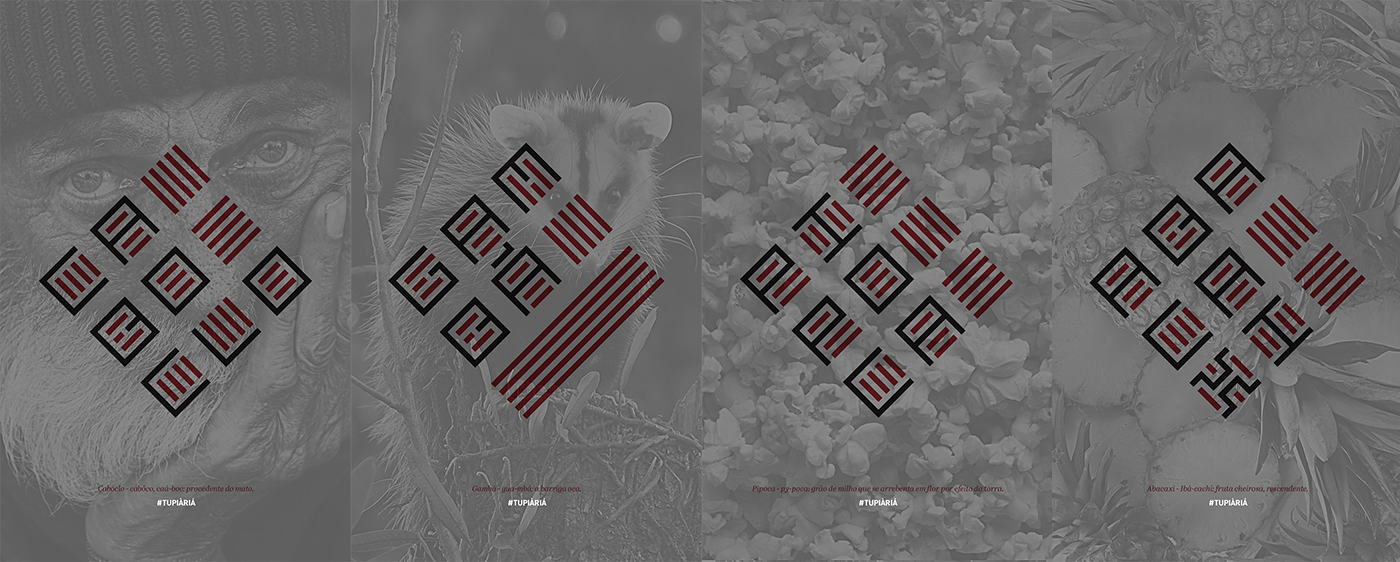 partindo do ponto que a falta de um alfabeto talvez possa ter auxiliado na perda de grande parte das tradições indígenas brasileiras, e até mesmo possa ter influenciado na ocultação do genocídio indígena que sangra a história do Brasil, Tupiàriá é um estudo tipográfico baseado na letras “encontradas” nas simbologias escritas em cerâmica, tecidos, utensílios de madeira, cestaria e tatuagens. Não é, nem de longe, uma pretensiosa tentativa de reinventar de uma maneira escrita línguas que foram subjulgadas por nós em nosso processo de colonização. Tupiàriá trata-se apenas de um estudo visual feito com respeito aqueles que, apesar de não deixaram escrito e registrado, deram origem a muitas de nossas palavras.